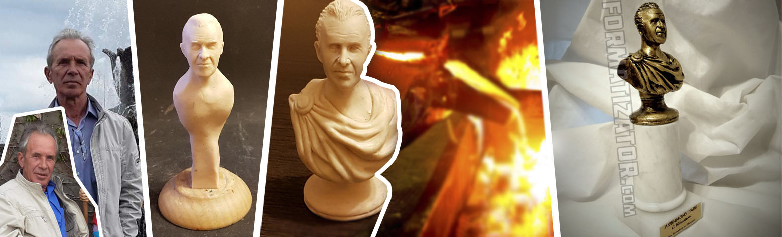 Изготовление миниатюрной скульптуры с портретным сходством по фото клиента. Материалы: металл, мрамор.